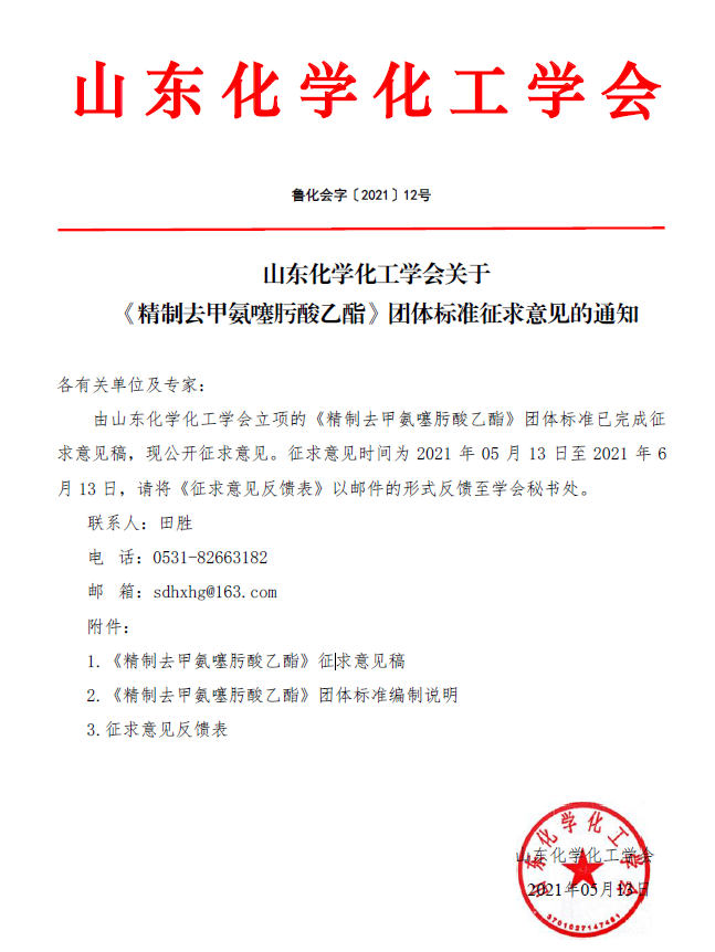 山東化學化工學會關于《精制去甲氨噻肟酸乙酯》團體標準征求意見的通知