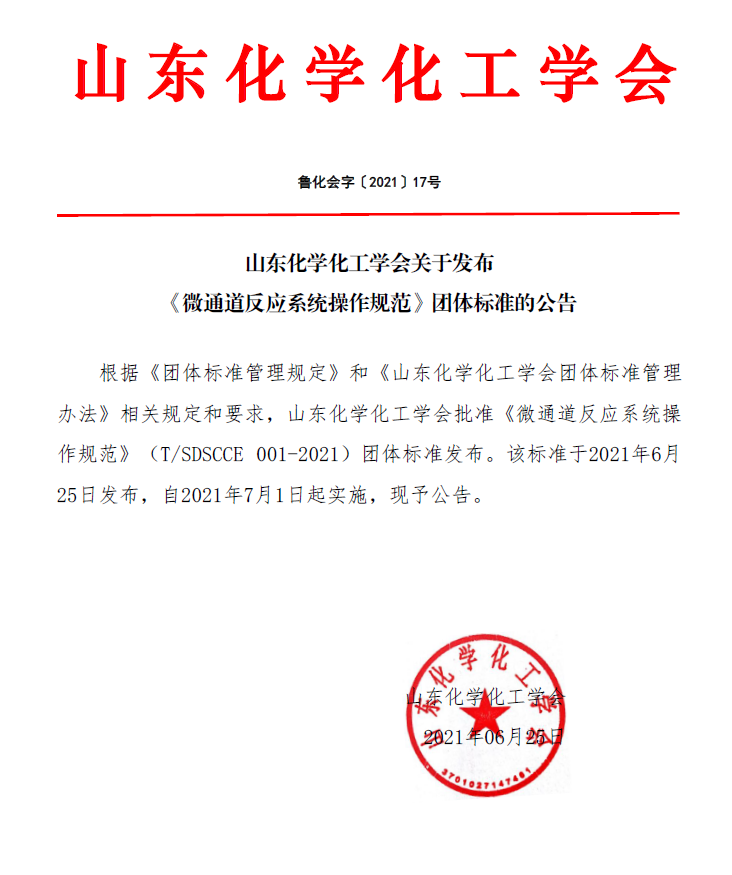 山東化學化工學會關于發(fā)布《微通道反應系統(tǒng)操作規(guī)范》團體標準的公告