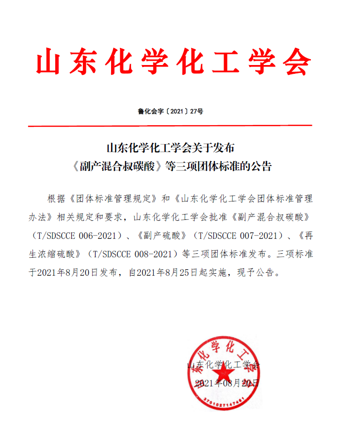 山東化學化工學會關于發布《副產混合叔碳酸》等三項團體標準的公告