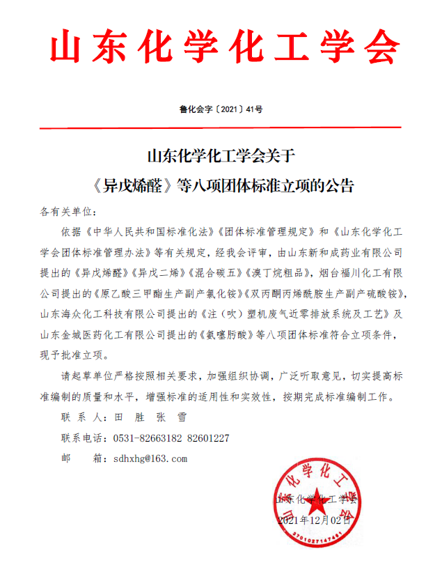 山東化學(xué)化工學(xué)會(huì)關(guān)于《異戊烯醛》等八項(xiàng)團(tuán)體標(biāo)準(zhǔn)立項(xiàng)的公告