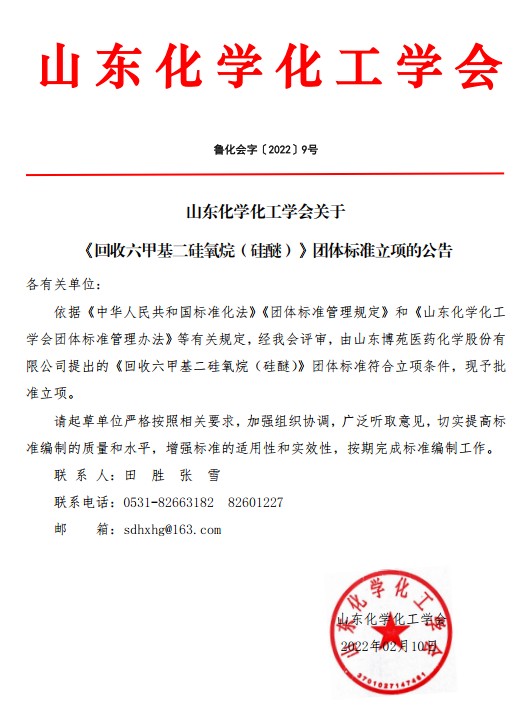 山東化學化工學會關于《回收六甲基二硅氧烷(硅醚)》團體標準立項的公告