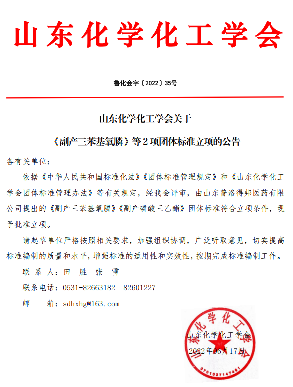 山東化學化工學會關于《副產三苯基氧膦》等2項團體標準立項的公告