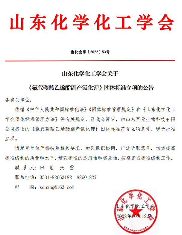 山東化學化工學會關于 《氟代碳酸乙烯酯副產氯化鉀》團體標準立項的公告