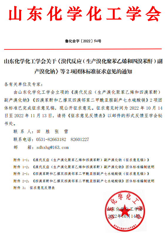 山東化學(xué)化工學(xué)會(huì)關(guān)于《溴代反應(yīng)(生產(chǎn)溴化聚苯乙烯和四溴苯酐)副 產(chǎn)溴化鈉》 等2項(xiàng)團(tuán)體標(biāo)準(zhǔn)征求意見(jiàn)的通知