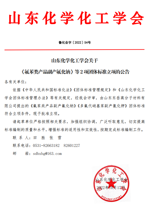 山東化學化工學會關于《氟苯類產品副產氟化鈉》等2項團體標準立項的公告