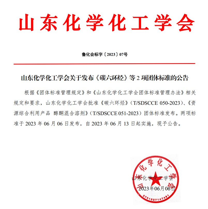 山東化學化工學會關于發布《碳六環烴》等2項團體標準的公告