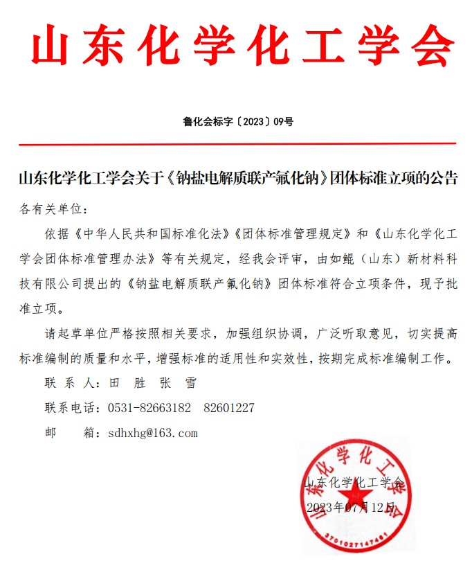 山東化學化工學會關于《鈉鹽電解質聯產氟化鈉》團體標準立項的公告