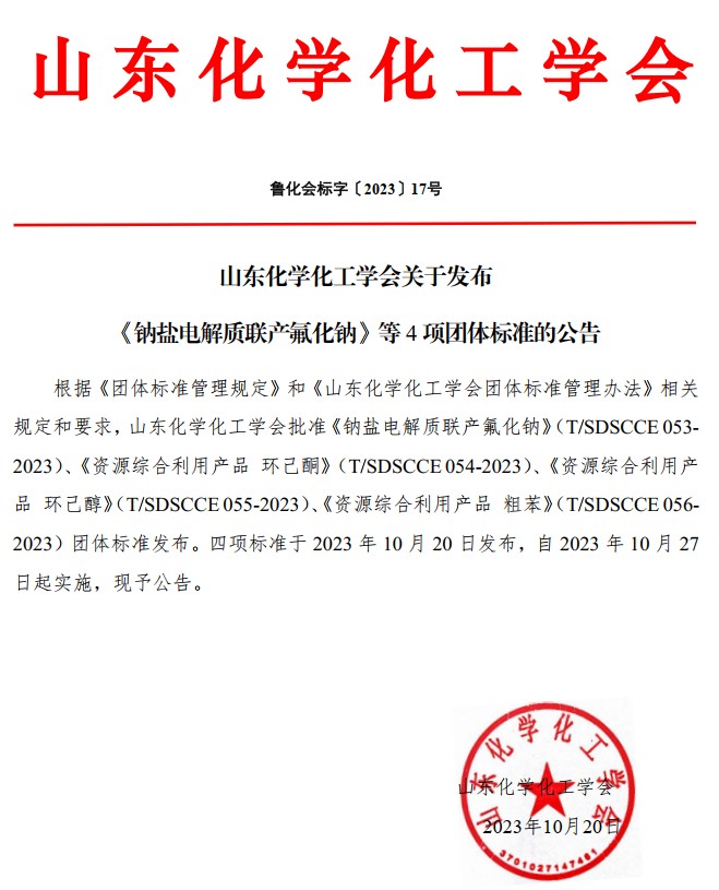 山東化學化工學會關于發(fā)布《鈉鹽電解質(zhì)聯(lián)產(chǎn)氟化鈉》等4項團體標準的公告
