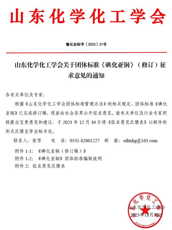 山東化學化工學會關于團體標準《碘化亞銅》(修訂)征求意見的通知