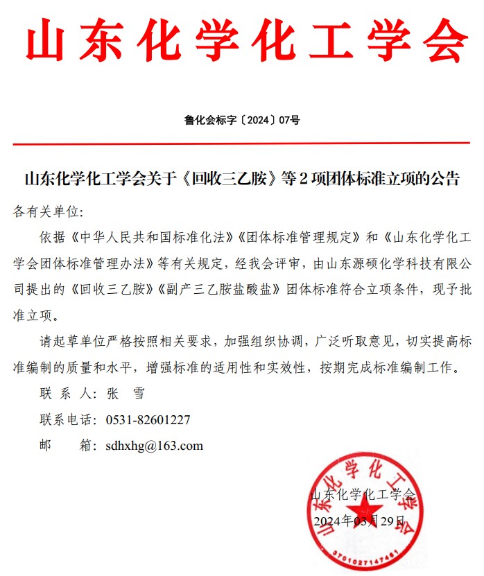 山東化學(xué)化工學(xué)會關(guān)于《回收三乙胺》等2項團(tuán)體標(biāo)準(zhǔn)立項的公告
