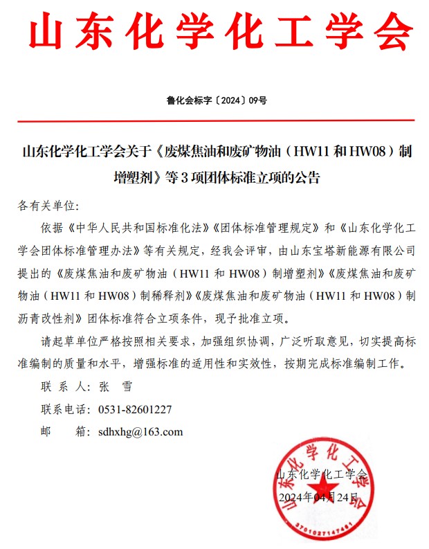 山東化學化工學會關于《廢煤焦油和廢礦物油(HW11和HW08)制增塑劑》等3項團體標準立項的公告