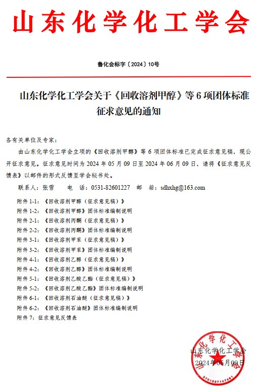 山東化學化工學會關于《回收溶劑甲醇》等6項團體標準征求意見的通知