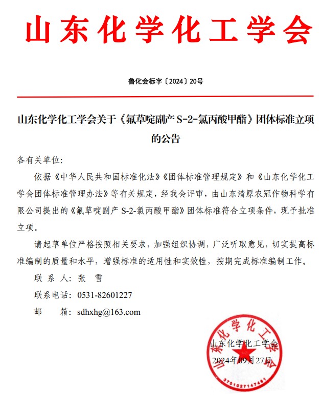 山東化學化工學會關于《氟草啶副產S-2-氯丙酸甲酯》團體標準立項的公告