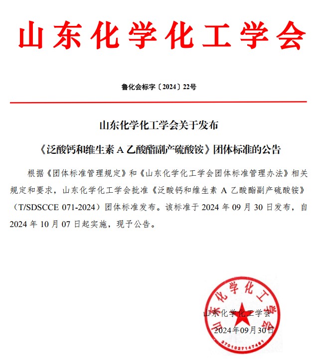 山東化學化工學會關于發布《泛酸鈣和維生素A乙酸酯副產硫酸銨》團體標準的公告