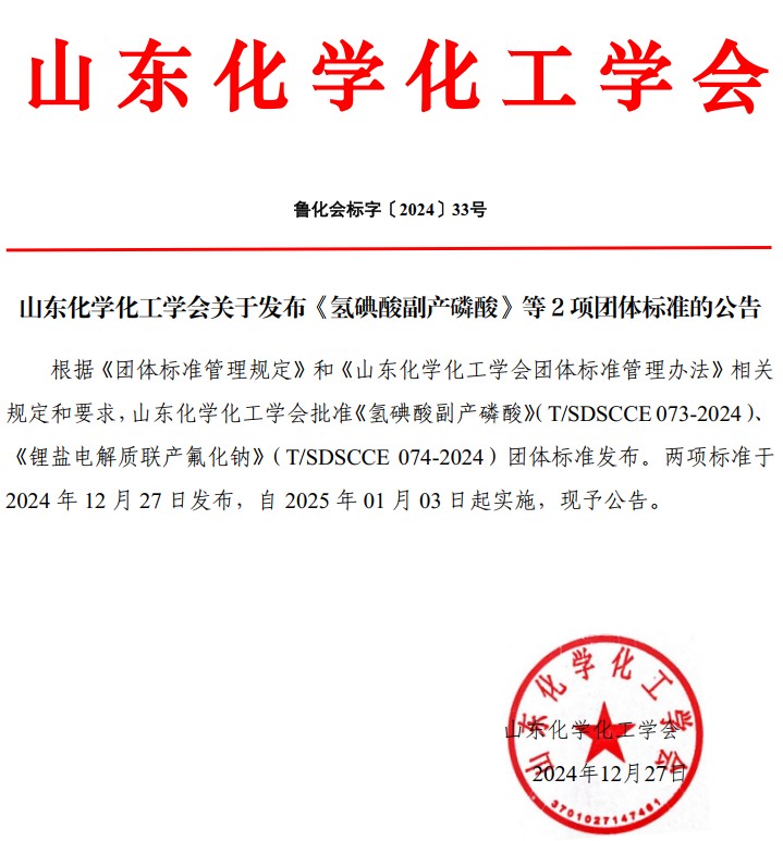 山東化學(xué)化工學(xué)會關(guān)于發(fā)布《氫碘酸副產(chǎn)磷酸》等2項團(tuán)體標(biāo)準(zhǔn)的公告