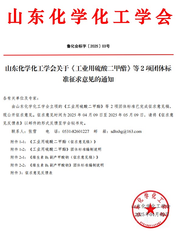 山東化學(xué)化工學(xué)會關(guān)于《工業(yè)用硫酸二甲酯》等2項(xiàng)團(tuán)體標(biāo)準(zhǔn)征求意見的通知