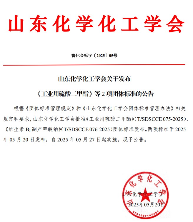 山東化學(xué)化工學(xué)會(huì)關(guān)于發(fā)布《工業(yè)用硫酸二甲酯》 等 2 項(xiàng)團(tuán)體標(biāo)準(zhǔn)的公告