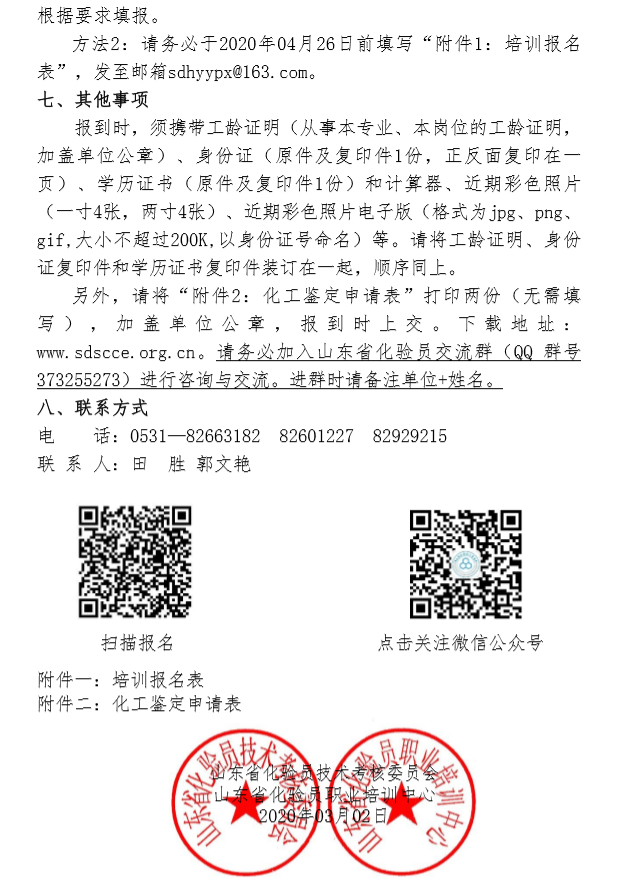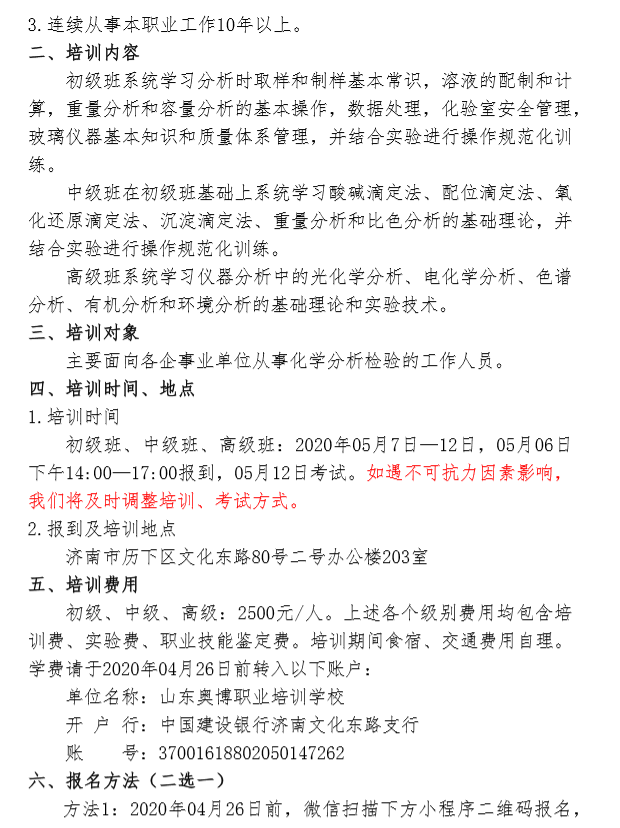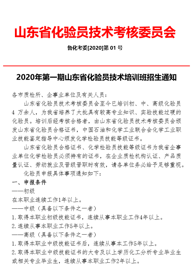 2020年第一期山東省化驗員技術培訓班招生通知