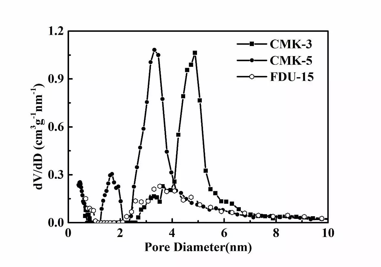 工作亮點:選用3種典型有序介孔碳材料為研究對象,對其吸附脫除低濃度氣相萘的能力進行了系統(tǒng)的評估,在研究方法上為實際應用中PAHs吸附劑的選擇提供了參考。圖(a)為3種介孔碳的孔道結(jié)構(gòu)及萘分子脫附示意圖;圖(b)為3種介孔碳的孔徑分布。
