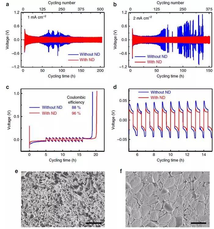 0.5mA cm-2電流密度下有添加劑(e)和無添加劑(f)的鋰沉積形貌。