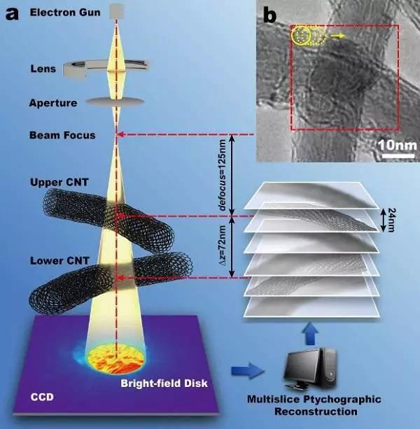 南京大學(xué)量子材料中心,亞原子電鏡實(shí)驗(yàn)室王鵬教授課題組在新型電子光學(xué)成像方法研究上取得系列進(jìn)展。結(jié)合超高分辨疊層衍射成像(Ptychography)方法在電子顯微鏡上實(shí)現(xiàn)了二維原子結(jié)構(gòu)像乃至三維成像,并在六硼化鑭晶體和用多壁碳納米管等納米材料上驗(yàn)證了這一成像方法。