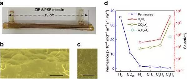 (d)ZIF-8中空纖維分離膜組件對不同氣體的透過行為。