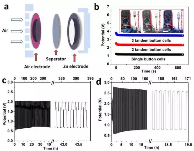 c) CoSx@PCN/RGO組裝的扣試鋅空電池充放電循環測試。