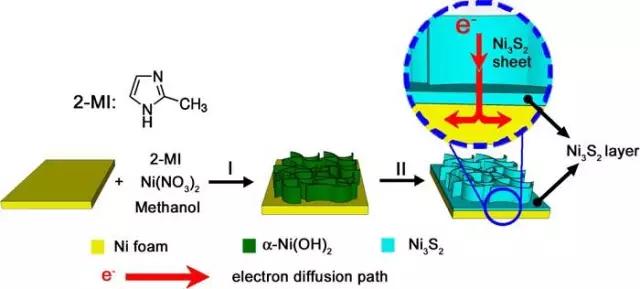第一步是一個(gè)在60°C低溫濕化學(xué)過(guò)程,以2-甲基咪唑(2-MI)為結(jié)構(gòu)導(dǎo)向劑,使α- Ni(OH)2納米片生長(zhǎng)在泡沫鎳基底上。第二步通過(guò)水熱硫化處理使α- Ni(OH)2轉(zhuǎn)化為為純相Ni3S2。這個(gè)過(guò)程也會(huì)將泡沫鎳基底的表層轉(zhuǎn)化為Ni3S2,以作為Ni3S2納米片與泡沫鎳基底之間的重要連接,建立一個(gè)高效的電子擴(kuò)散路徑。