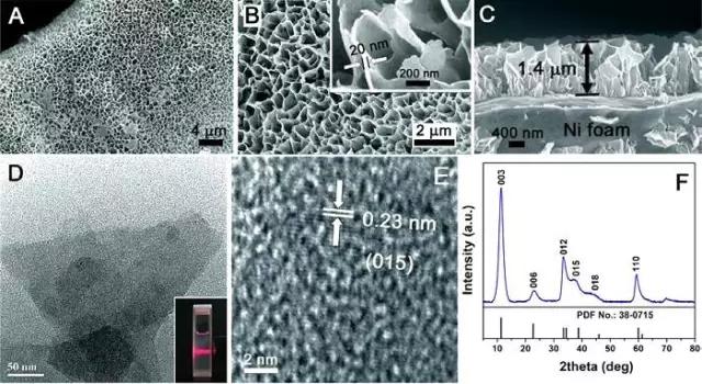 (D)為α- Ni(OH)2納米片的TEM圖像,插入照片顯示了含有α- Ni(OH)2納米片的膠體懸浮液具有丁達(dá)爾現(xiàn)象;