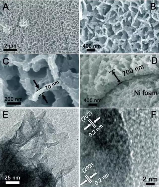 (E)為α- Ni(OH)2納米片的HRTEM圖像;
