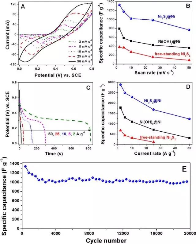 Ni3S2@Ni的電容量大,循環(huán)周期長(zhǎng),能量密度高。其性能優(yōu)越于大多數(shù)已報(bào)道的鎳基材料。