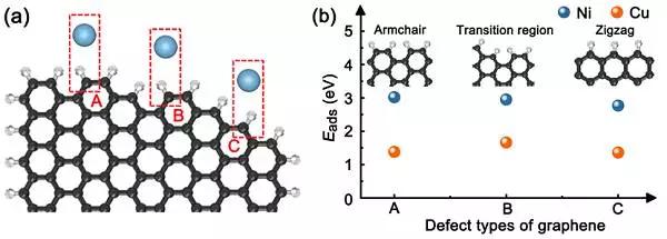 (b) 采用第一性原理計算鎳和銅原子對石墨烯3種結構的邊緣H吸附能