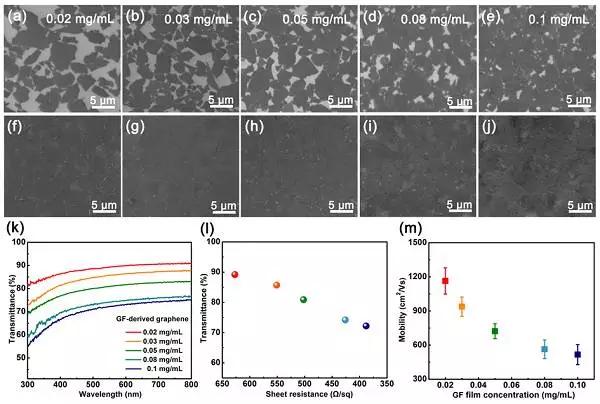 (l) 高質量石墨烯薄膜的透光度與方阻關系對比圖(對應SEM圖 f-j樣品)