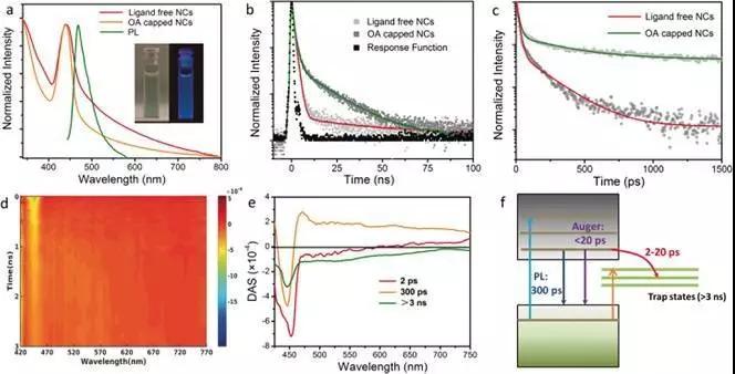 b.無(wú)表面活性劑的納米晶以及油酸包裹的納米晶時(shí)間分辨光譜對(duì)比圖