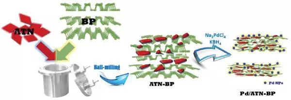 設計具有增強乙醇氧化反應(EOR)活性的高性能鈀(Pd)基底一直是一個挑戰。上海電力學院閔宇霖教授、徐群杰教授、范金辰副教授(共同通訊作者)等制備了一種新型銳鈦礦TiO2納米片-黑磷(ATN-BP)復合作為Pd納米粒子的基底,并將其用于EOR。在氬氣保護下,將BP納米片與ATN直接球磨形成ATN-BP復合材料,其中BP 納米片與碎裂ATN的通過P—O—Ti鍵互聯。ATN-BP結構不僅有利于改善電解質滲透和電子運輸,對通過Pd和ATN-BP之間的協同互動剝離活性中間體也有很強的影響。結果表明具有Pd、BP和ATN的異質界面的Pd/ATN-BP復合材料展示出超高的電催化活性和耐久性。