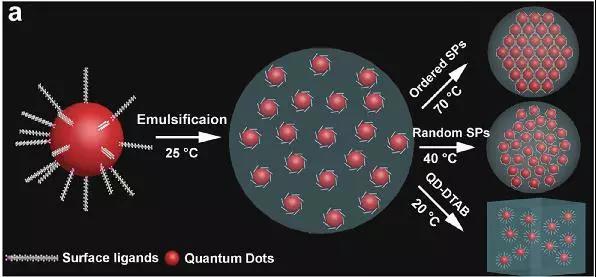 納米晶體表面一般利用絕緣有機配體鈍化,但有機配體阻礙了自組裝納米粒子相鄰模塊之間的電子傳遞。配體切除或交換是一種促進電子轉移的可行策略,但通常表面狀態變化會導致性能下降或不可控的團聚。中科院化學所王鐵教授(通訊作者)等利用熱控制乳液基自組裝方法制備了具有界限清晰超晶格域的3D超緊超粒子。超粒子中的粒子間距縮小至約0.3 nm,因為有機配體匍匐于納米顆粒表面,足以克服電子轉移的障礙。有序緊致的超結構促進了CdSSe量子點(QDs)之間的耦合和電子能量傳遞。