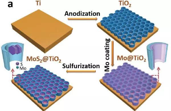 近日,美國中佛羅里達大學楊陽教授和太平洋西北國家實驗室杜英歌高級研究員(共同通訊作者)等利用電化學腐蝕的方法制備出有序排列的TiO2納米管陣列薄膜,之后在TiO2納米管內表面均勻生長出多層硫化鉬(MoS2)納米片,并將其應用于太陽光分解水制氫中。通過實驗和理論計算證明MoS2中的硫缺陷是造成該材料具有可見光吸收的原因,結合TiO2的紫外光吸收和MoS2本身的近紅外光吸收,制備出一種具備寬光譜吸收的催化劑。TiO2納米管陣列不僅起到吸收紫外光的作用,同時作為MoS2催化劑的基底,從而提高太陽光的利用效率和光催化過程的穩定性。進一步的實驗證明上述催化劑可實現分解海水制氫。