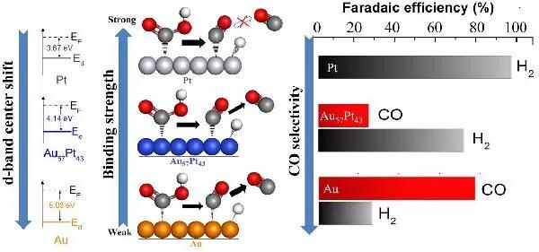 Au電催化劑可將CO2還原為CO,然而Au的催化活性仍然受到CO2活化的限制。相反,Pt可將CO2活化并轉換成吸附態CO。荷蘭代爾夫特理工大學Wilson A. Smith (通訊作者)等首次探究了具有可控組成和平面形態的Au-Pt雙金屬薄膜的電催化還原 CO2性能。通過實驗和理論系統性研究了二元催化劑組成的對還原CO2催化活性和選擇性的影響機制,主要產物的形成(H2和CO)與表面成分的變化密切相關,而HCOOH的形成發生在較低的電位,產量顯著提高。因此,兩種金屬的表面組成和雙金屬協同作用都有助于Au-Pt 電催化劑還原CO2的整體性能提升。