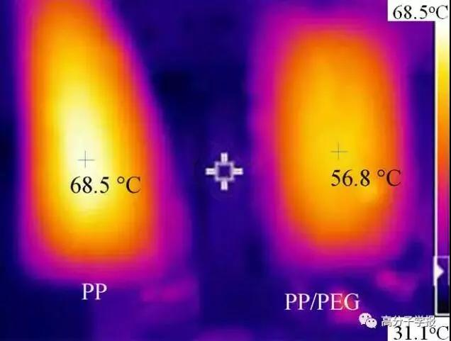 他們進一步采用紅外成像儀在發泡樣品取出后快速測試了樣品內部與表層溫度。從紅外成像照片可以看到,PP/PEG共混物泡沫樣品的內部溫度明顯低于純PP泡沫樣品。這一結果證明吸附的水確實起到原位冷卻作用,從而促進泡孔壁的冷卻和定型,防止了泡沫芯部泡孔合并和塌陷現象發生。上述發現為高效制備結構均勻的聚合物發泡材料奠定了理論基礎。