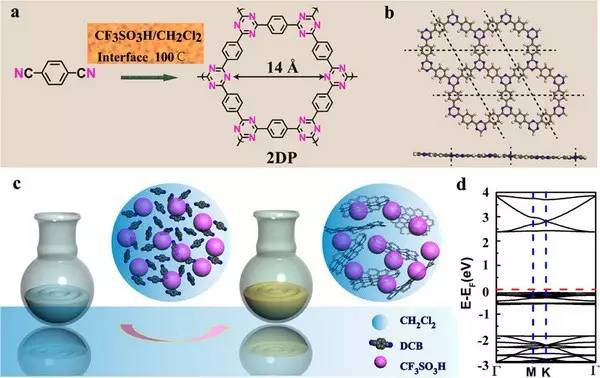 (a)二維含三嗪高分子的合成路線圖,主要利用了1, 4-間苯二腈在二氯甲烷和三氟甲磺酸的界面發生腈三聚反應合成;