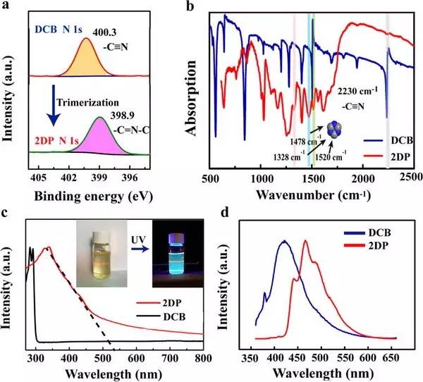 (c)間苯二腈和二維含三嗪高分子的紫外光譜圖,插圖展示了二維含三嗪高分子分散液在放置紫外燈下前后的照片對比;