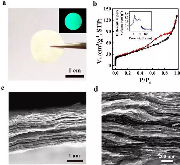 (a)懸浮的二維含三嗪高分子薄膜的照片,插圖是其在紫外燈下的熒光圖像;