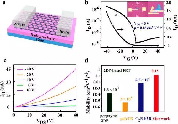 (d)二維含三嗪高分子的遷移率同最近報道的幾種二維高分子材料的對比,結果顯示此法合成的二維含三嗪高分子的具有較高的遷移率。