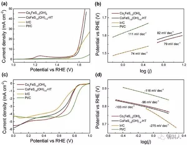 圖三:Co3FeS1.5(OH)6, CoFeS1.6(OH)1.8-HT和貴金屬催化劑的OER/ORR性能測試