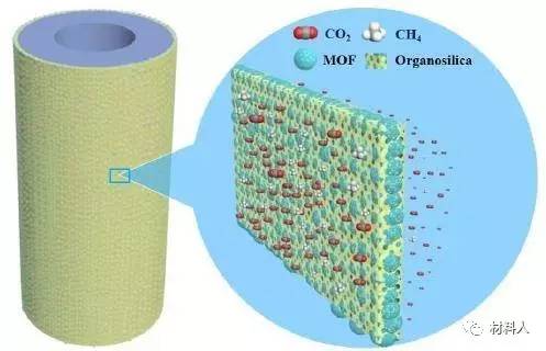 圖1:以管狀氧化鋁為基質的MOF/ 有機硅納米復合材料膜上用于氣體分離示意圖。