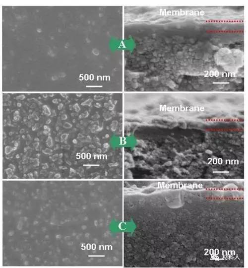 (C) CAU-1-NH2/有機硅薄膜掃描電鏡的圖像的表面和橫截面視圖。
