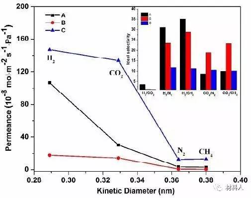 (A) ZiF-8/有機硅薄膜對H2 ,N2,CO2 和CH4 的通量;