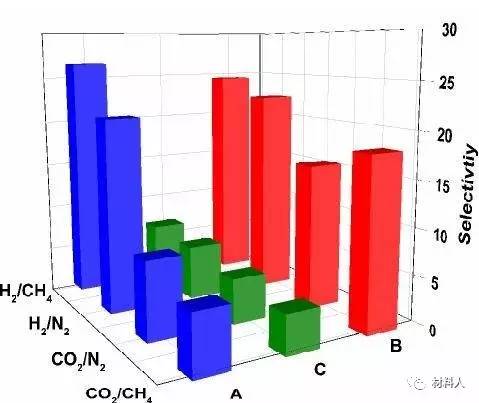 (B) MIL-53-NH2/有機硅薄膜對H2/CH4,H2/N2,CO2/CH4的CO2/N2的選擇吸附性;