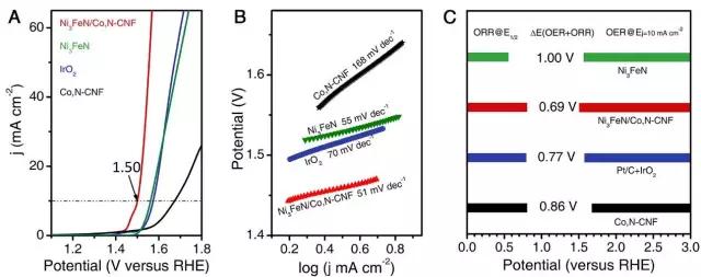 近期,中科院理化技術(shù)研究所張鐵銳研究員等人在Nano Energy上發(fā)表一篇題為:“3D Carbon Nanoframe Scaffold-immobilized Ni3FeN Nanoparticle Electrocatalysts for Rechargeable Zinc-Air Batteries’ Cathodes”的文章。本論文利用組分間的協(xié)同效應(yīng),可控制備了一種鈷氮共摻雜碳載體(Co,N-CNF)負(fù)載14 nm Ni3FeN的納米雙功能催化劑。其中,Co,N-CNF不僅具有優(yōu)良ORR性能,并可有效減小Ni3FeN在高溫合成過程中的團(tuán)聚問題,從而縮小其尺寸,使得該復(fù)合催化劑的OER性能明顯優(yōu)于IrO2,ORR性能超過Pt/C,而且該復(fù)合催化劑可在可逆鋅空氣電池的高電流密度(50 mA cm-2)下穩(wěn)定工作。該策略為設(shè)計(jì)和合成多功能催化劑提供了新思路。