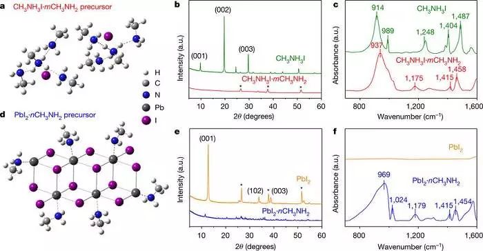 圖1 前體CH3NH3I·mCH3NH2的原理結構及其XRD圖譜和FTIR光譜